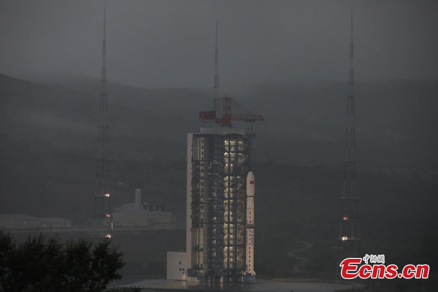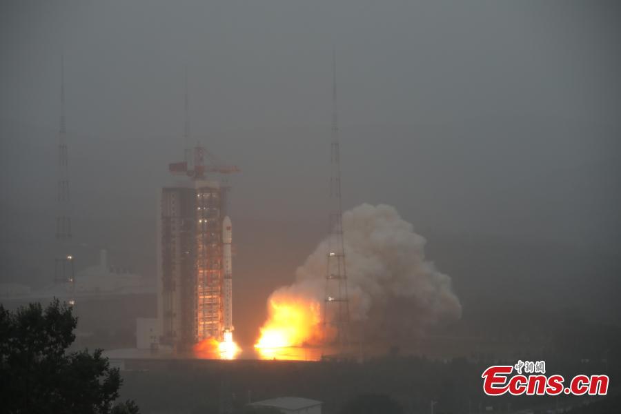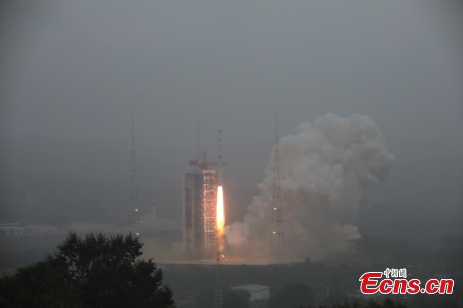 A Long March-4B carrier rocket carrying the Tianhui II-02 satellite group lifts off from the Taiyuan Satellite Launch Center in north China's Shanxi Province, August 19, 2021. China launched the Tianhui II-02 satellite group at 6:32 a.m. on Thursday. It was the 384th flight mission of the Long March series carrier rockets. (Photo/Courtesy of Zheng Bin)