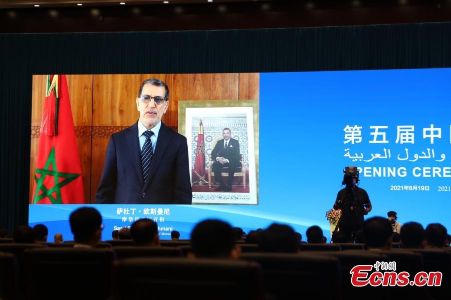 Moroccan Prime Minister Saad Eddine El Othmani gives an online speech at the open ceremony of the fifth China-Arab States Expo in Yinchuan, northwest China's Ningxia Hui Autonomous Region, August 19, 2021. (Photo: China News Service/Li Peishan)
