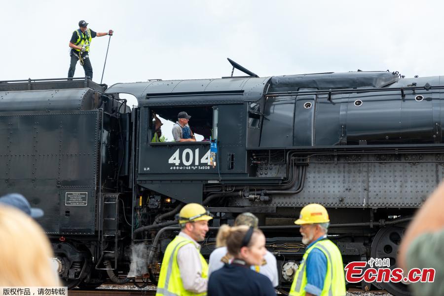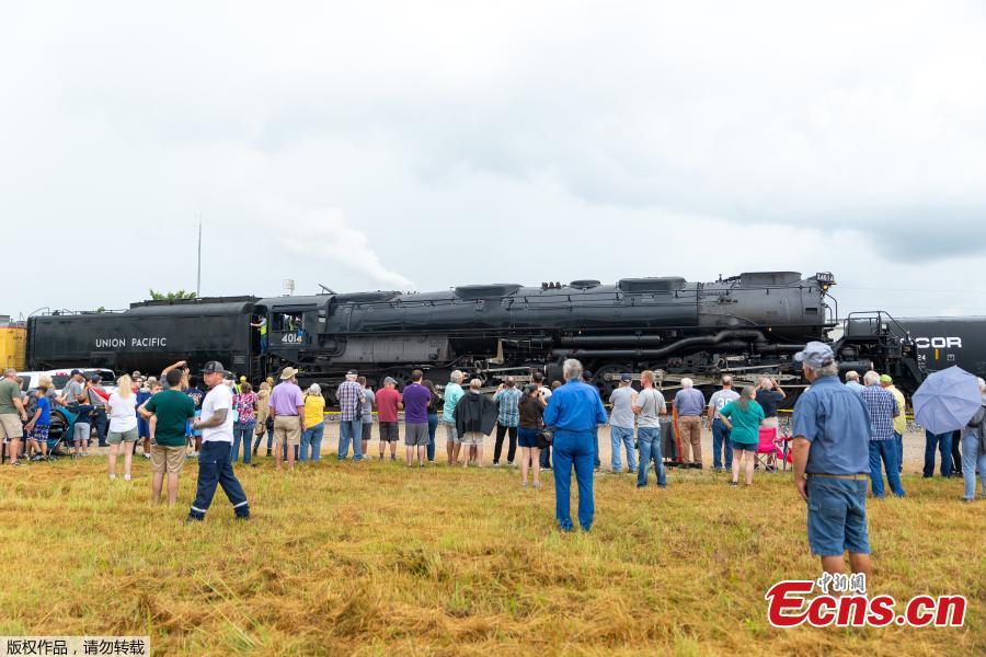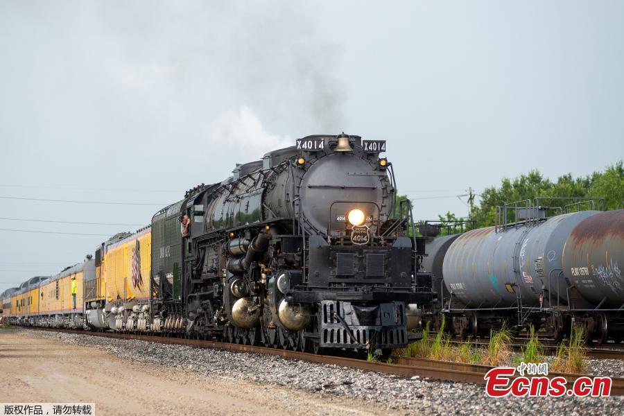 The Union Pacific Big Boy, the world's largest steam locomotive, is seen in Texas, the United States, Aug. 18, 2021. The Big Boy steam locomotive, which is about five meters tall and 40 meters long, was originally built in 1941. It is currently traveling around the United States after a massive restoration. (Photo/VCG)