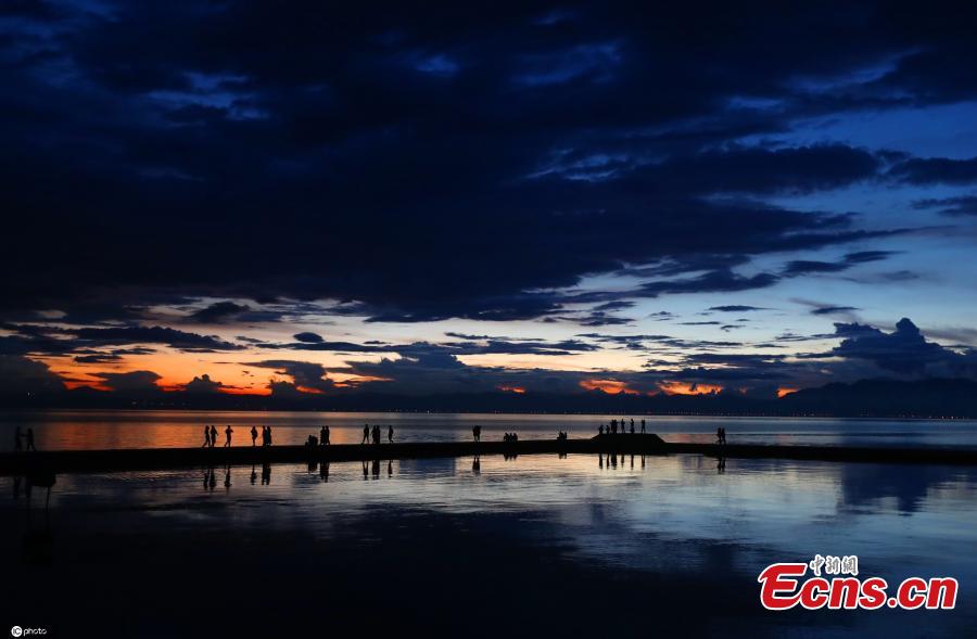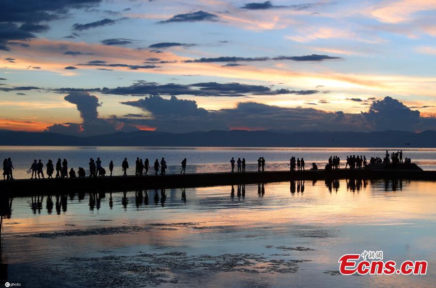 Tourists enjoy the fascinating sunset scenery of Dianchi Lake, known as the "Sparkling Pearl Embedded in a Highland," in Haiyan village in Kunming, southwest China's Yunnan Province, August 19, 2021. (Photo/ICphoto)
