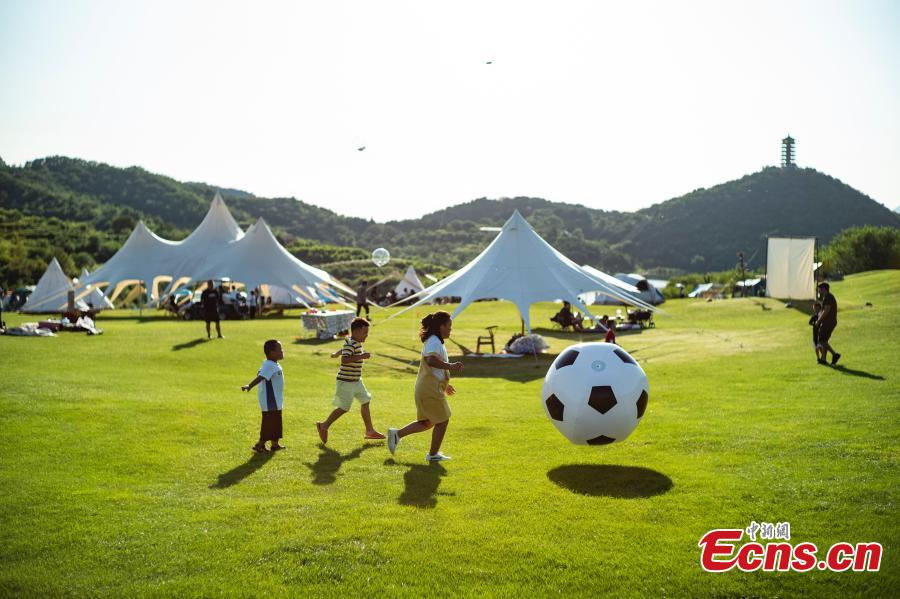 Children chase and play on the lawn at Jinhai Lake scenic spot, Pinggu district, Beijing, China, August 21, 2021. (Photo: China News Service/ Hou Yu)