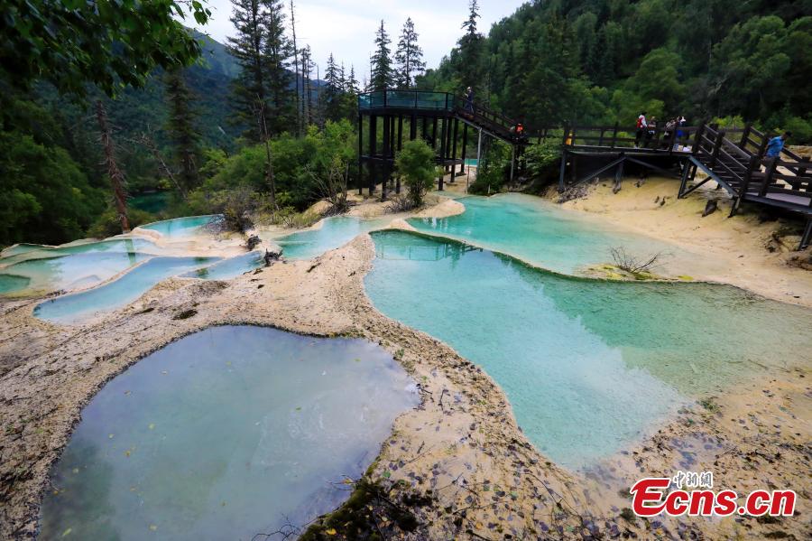 Visitors walk on a bridge in the Nen Ensangcuo scenic spot, Jiuzhaigou County, Ngawa Tibetan and Qiang Autonomous Prefecture, northwest China's Sichuan Province, August 23, 2021. (Photo: China News Service/ Wang Lei)