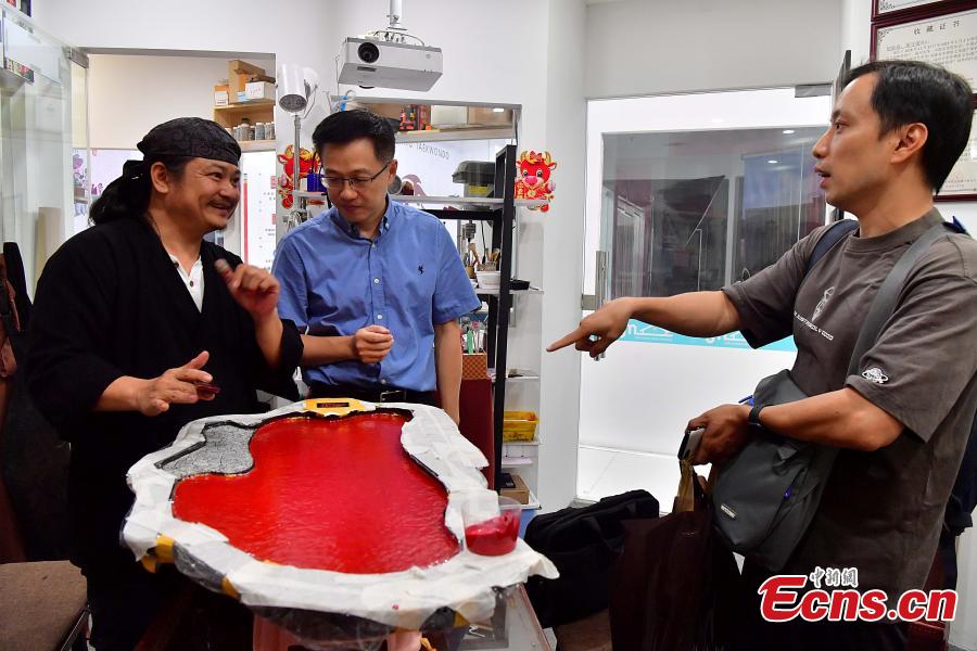 Huang Shoukun(L) communicates with friends about the lacquer crafting, Fuzhou, Fujian Province, August 24, 2021. (Photo: China News Service/ Zhang Bin)