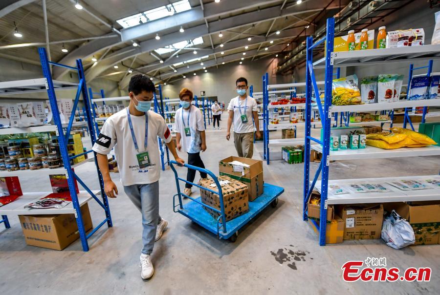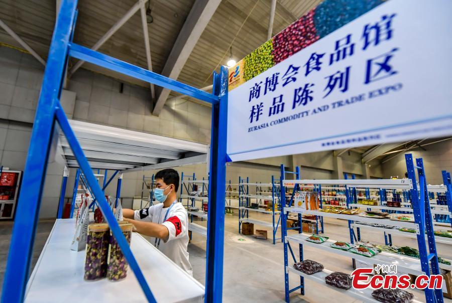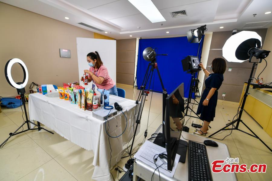 Staff tidy the products to prepare for the live show during the (China) Eurasia Commodity and Trade Online Expo 2021, Urumqi, China's Xinjiang Uygur Autonomous Region, on August 25, 2021. (Photo: China News Service/ Liu Xin)