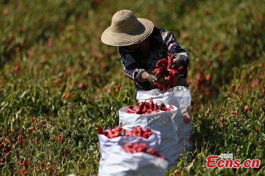 A farmer harvests chili peppers in a field in Yanqi County, northwest China's Xinjiang Uygur Autonomous Region, on August 24, 2021. About 40, 000 mu (about 2, 666 hectares) chili peppers cultivated in the Yanqi basin have ripen. (Photo by China News Service)