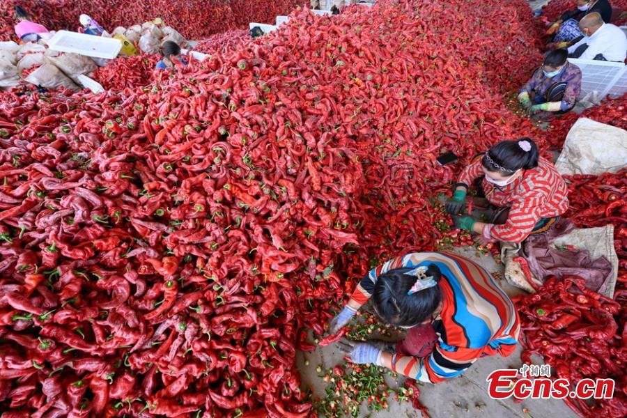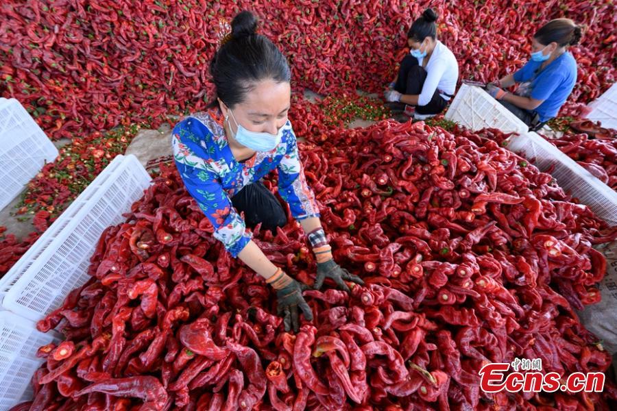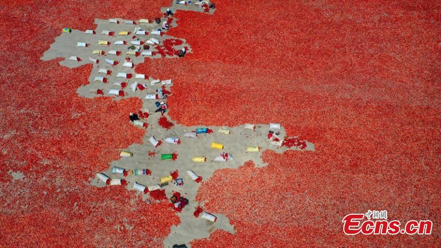 Farmers dry chili peppers at a yard, Bohu County, northwest China's Xinjiang Uygur Autonomous Region, on August 24, 2021. (Photo by China News Service)
