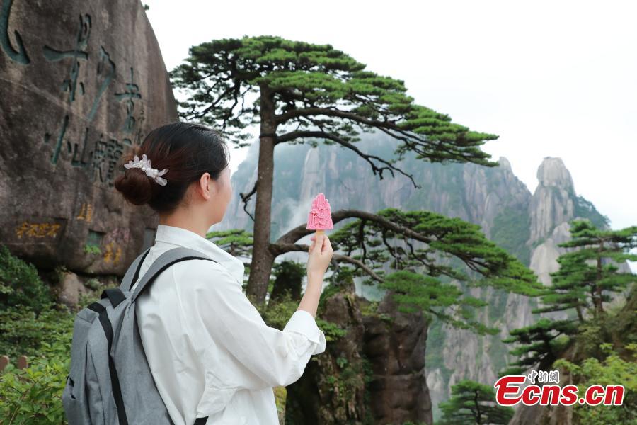 A visitor takes a photo of the pinky ice cream in the shape of famous Greeting Pine on the Huangshan Mountain in Anhui Province, August 26, 2021. Inspired by the shape of the Greeting Pine, a famous landmark on the mountain, this innovative cultural and creative product has aroused visitors' interests. (Photo/ Zhang Tao)