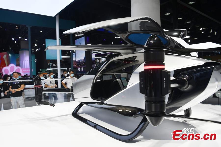 An electric flying car that can carry two passengers and fly at 130 kilometers per hour is on display at the Chengdu International Motor Show in Chengdu, Sichuan on Aug. 29, 2021. (Photo: China News Service/Zhang Lang)