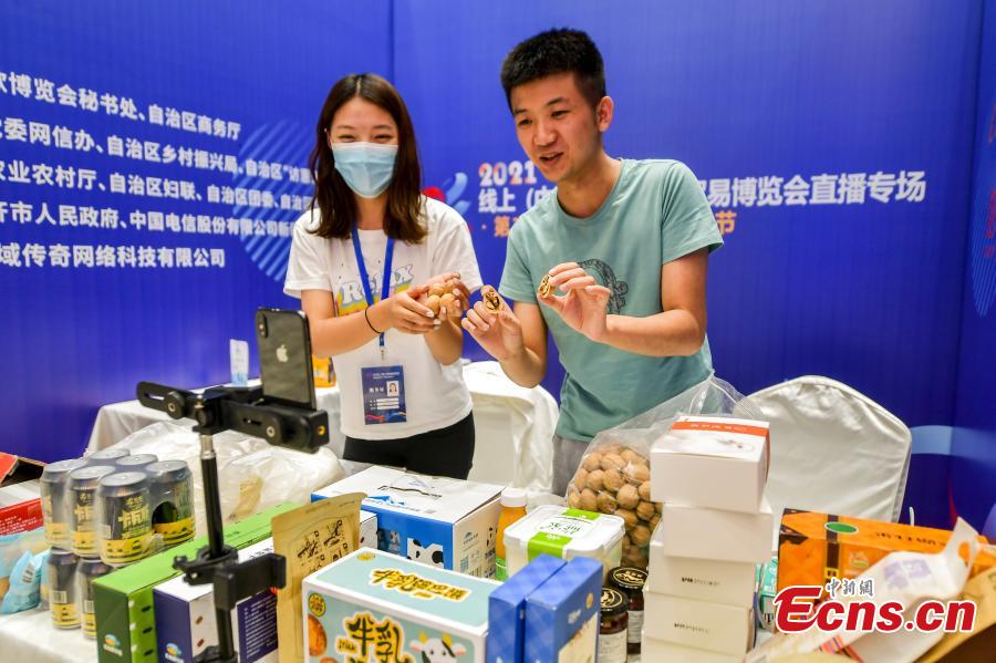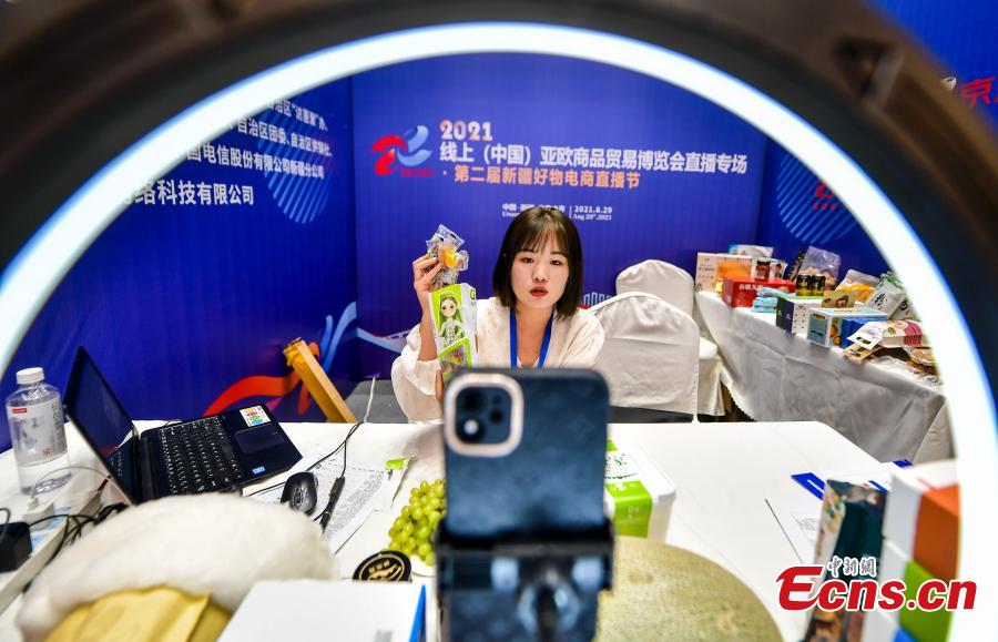 An anchor recommends Xinjiang agricultural products to netizens through the online platform at the 2021 Online Asia-Europe Commodity Trade Fair, in Urumqi, Xinjiang Uygur Autonomous Region, Aug. 29, 2021. (Photo: China News Service/Liu Xin)