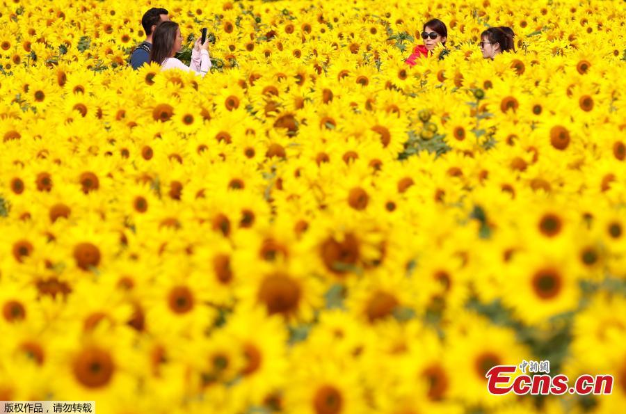 People take pictures among sunflowers at The Pop Up Farm in Flamstead, St Albans, Britain, August 29, 2021. (Photo/Agencies)