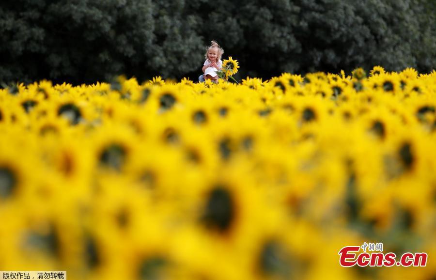 Skyla sits on her father's shoulders, amongst sunflowers at The Pop Up Farm in Flamstead, St Albans, Britain, August 29, 2021. (Photo/Agencies)