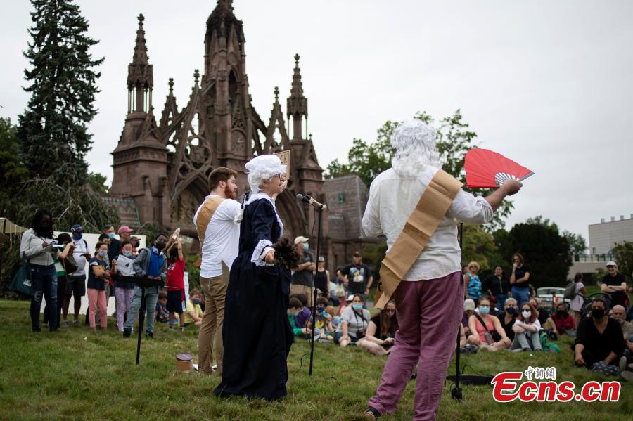 Actors perform historical stories at Green-Wood Cemetery, New York, the United States, Aug. 29, 2021. (Photo: China News Service/Liao Pan)