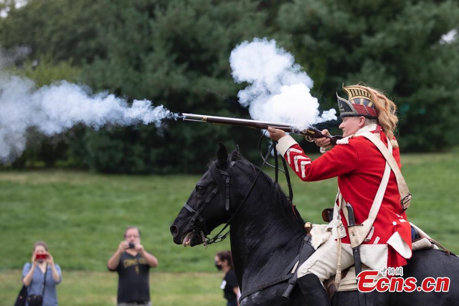 An actor performs horseback shooting at Green-Wood Cemetery, New York, the United States, Aug. 29, 2021. (Photo: China News Service/Liao Pan)