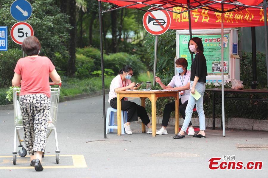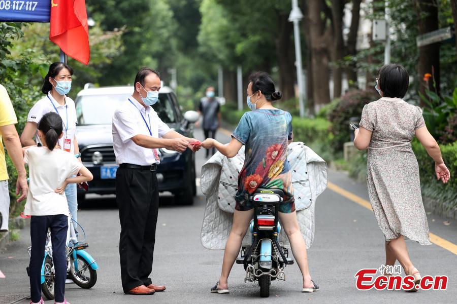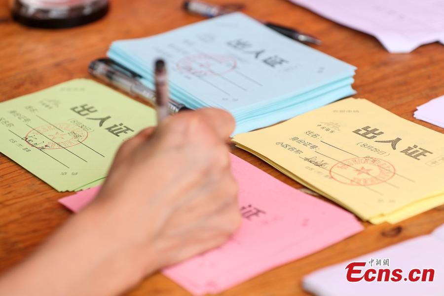 Staff workers of communities hand out key cards to residents in Yangzhou, Jiangsu Province, Aug. 29, 2021. (Photo/VCG)