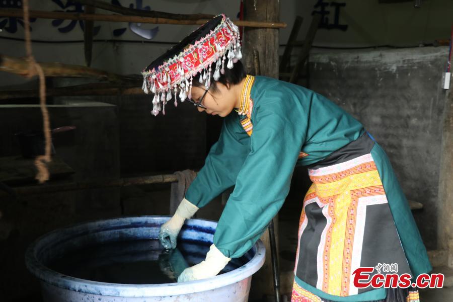 A Miao painting woman places the waxed fabric in a designated color plant dyeing solution to color the fabric, Jianzhu Intangible Cultural Heritage Experience Base, Gulin County, Luzhou City, Sichuan Province, Aug. 30, 2021. (Photo/Zhang Lei)