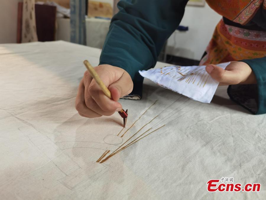 A Miao painting woman draws with an iron wax knife in Jianzhu Intangible Cultural Heritage Experience Base, Gulin County, Luzhou City, Sichuan Province, Aug. 30, 2021. (Photo/Tu Yisha)