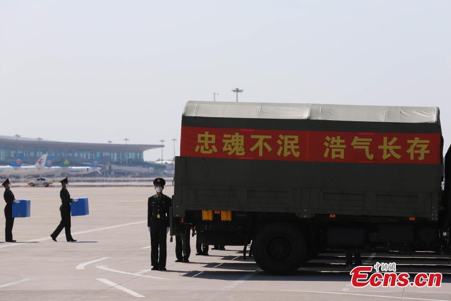 A Chinese military plane carrying the remains of 109 Chinese soldiers killed in the 1950-53 Korean War lands at the Taoxian International Airport in Shenyang, northeast China's Liaoning Province, Sept. 2, 2021. (Photo: China News Service/Wang Jingwei)