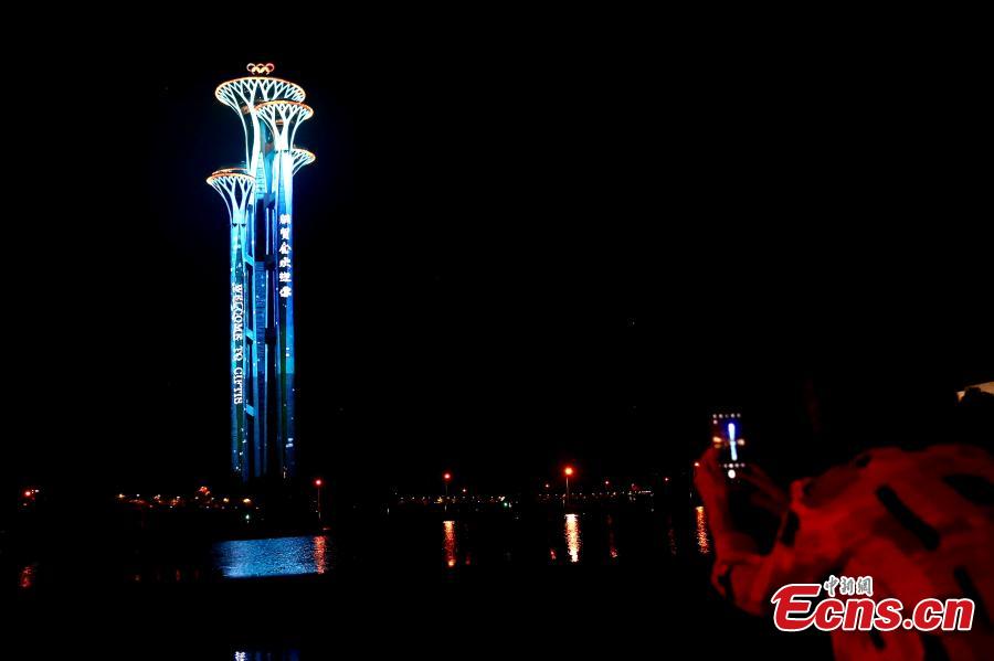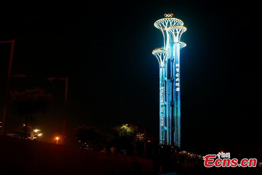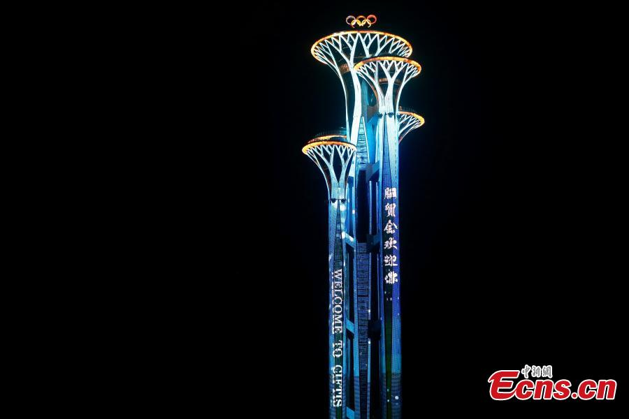 The Olympic Tower in Beijing, capital of China, is illuminated with the words "Welcome to China International Fair for Trade in Services (CIFTIS)," Sept. 2, 2021. The CIFTIS, a major platform for trade in services in China, will be held from Sept. 2 to 7. (Photo: China News Service/Yi Haifei)