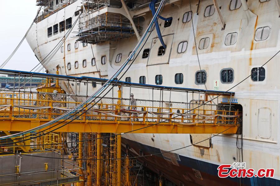 Aerial photo taken on Sept. 2, 2021 shows the hull of H1508, China's first large-scale cruise ship, is under construction. Bow bridge and nine main sections of the ship was in place Thursday. This marks the construction of the main hull is to be finished. (Photo: China News Service/Yin Liqin)