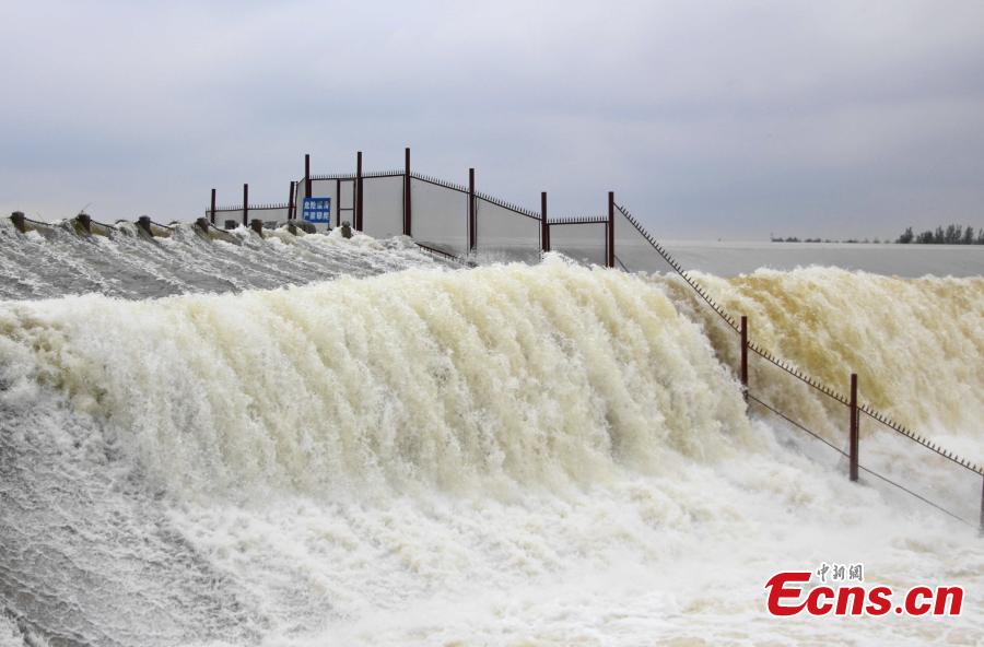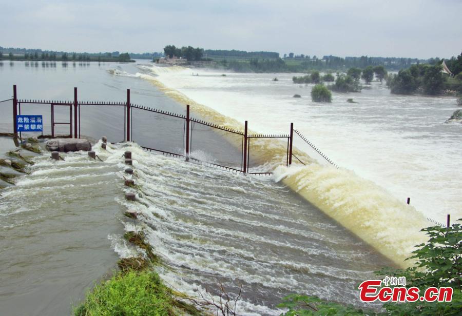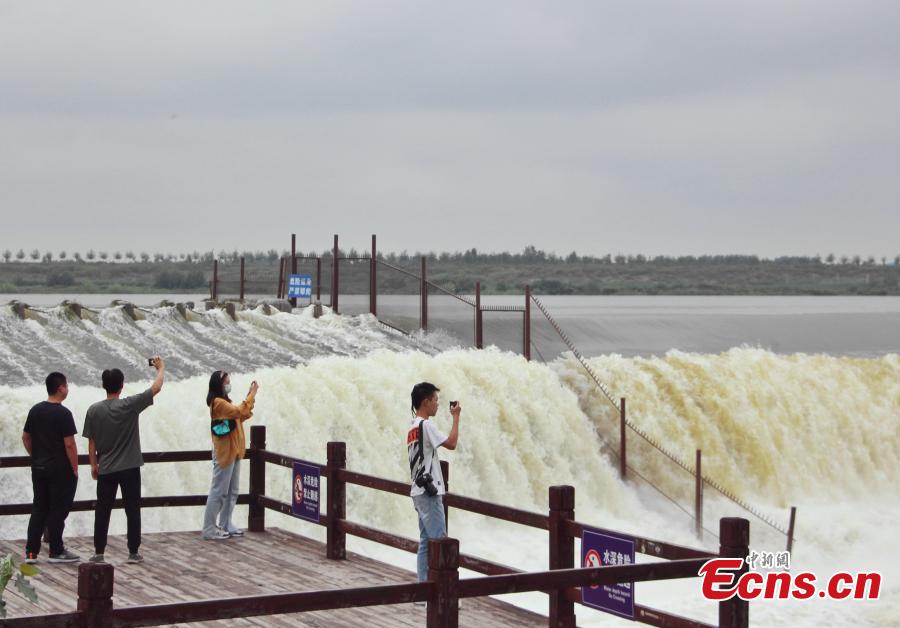 Water roars down Daicun Dam in Taian, Shandong Province, Sept.2, 2021 after the city was hit by rainstorms for several days. Known as the "heart of the canal," Daicun Dam plays a vital role in the Beijing-Hangzhou Grand Canal. (Photo: China News Service/Zhao Xiao)