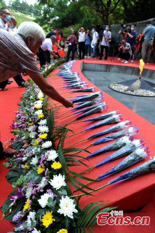 People from all walks of life present flower baskets to a memorial wall at the Sanshan Cultural Memorial Park in Fuzhou, Southeast China's Fujian Province, Sept. 3, 2021. (Photo: China News Service/Zhang Bin)