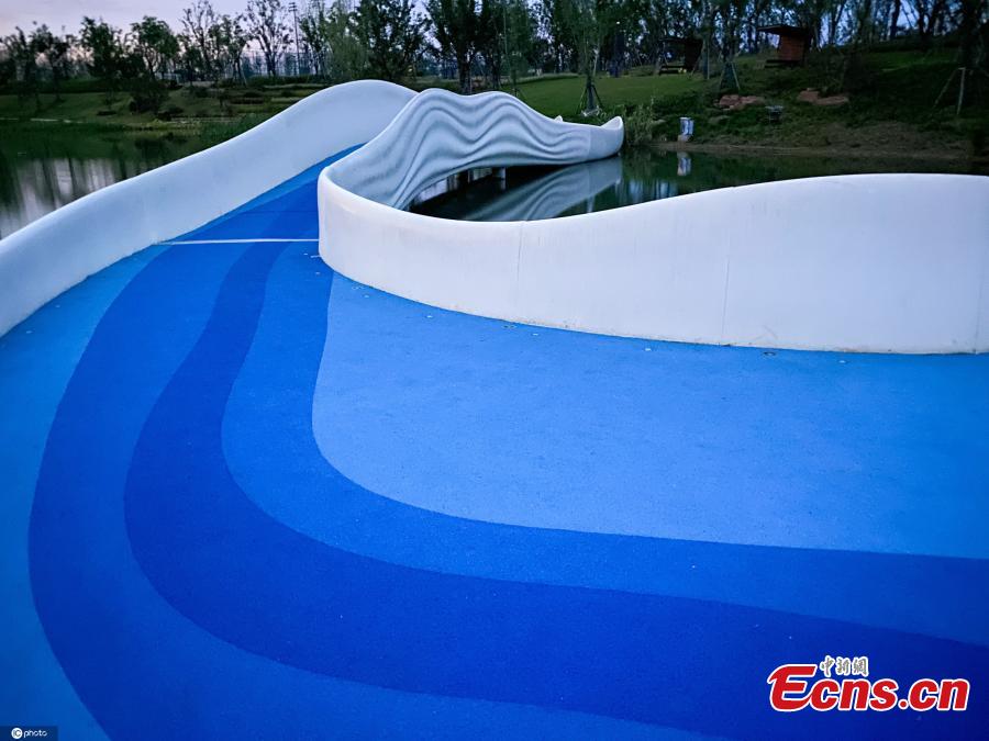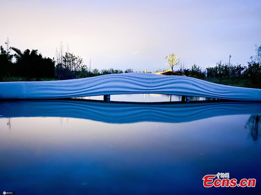 A 3D-printed polymer bridge has been unveiled in Yima River Park, Longquanyi District, Chengdu, Southwest China's Sichuan Province. Liuyun Bridge, looking like a moving cloud belt, is 66.8 meters long, with the 3D-printed part standing at 21.58 meters long. The form of this blue-and-white bridge is inspired by the shape of Yima River and waving silks. (Photo/IC Photo)