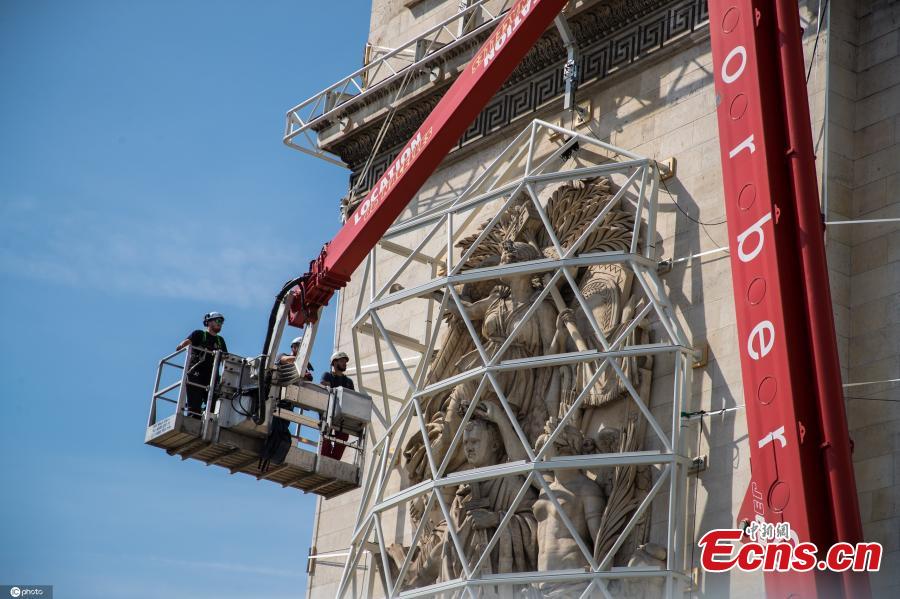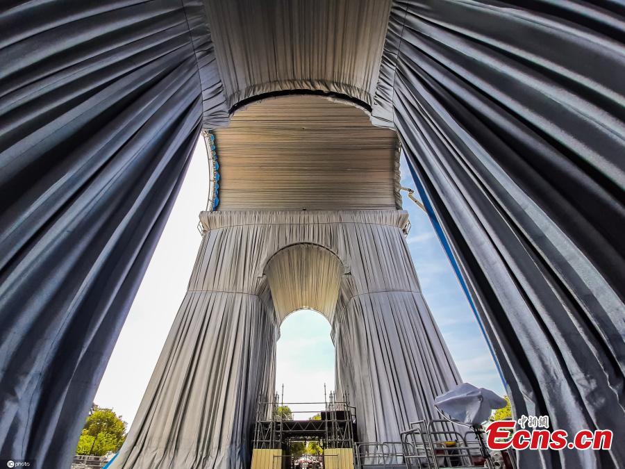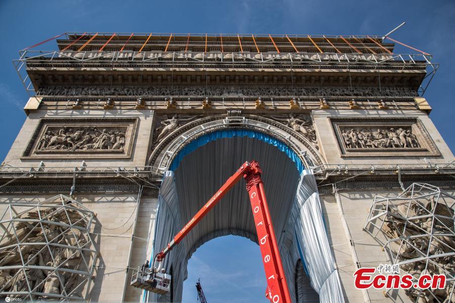 Photo taken on Sept. 6, 2021 shows the project of wrapping the Arc de Triomphe in Paris, France. The project will fulfill the late artist Christo's last wish, which is to wrap the Arc de Triomphe with 25,000 square meters of fabric and 3,000 meters of red rope. The project will cost 14 million Euros (about $16 million). (Photo/IC)