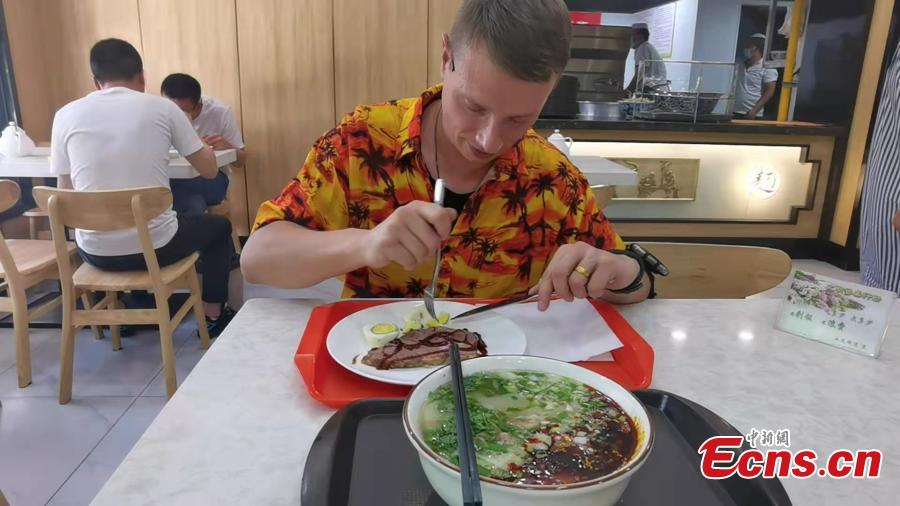 A customer tries new beef noodles at a restaurant in Lanzhou, northwest China's Gansu Province. The beef noodle restaurant now allow customers to order a 30 yuan (about $4) steak with an egg.