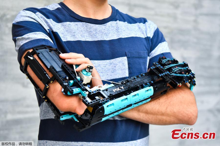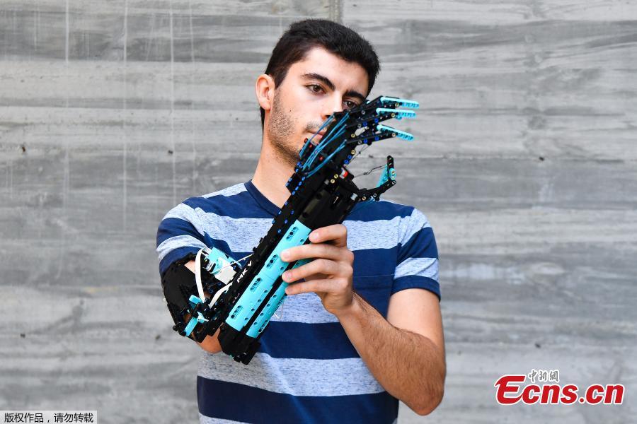 Twenty-two-year old Andorran university student David Aguilar, the 2017 Guinness World record holder and 2020 Lego Masters France winner, poses with his self-built prosthetic arm, made with Lego pieces, in Sant Cugat del Valles, near Barcelona on September 9, 2021. (Photo/ Agencies)