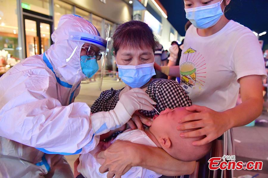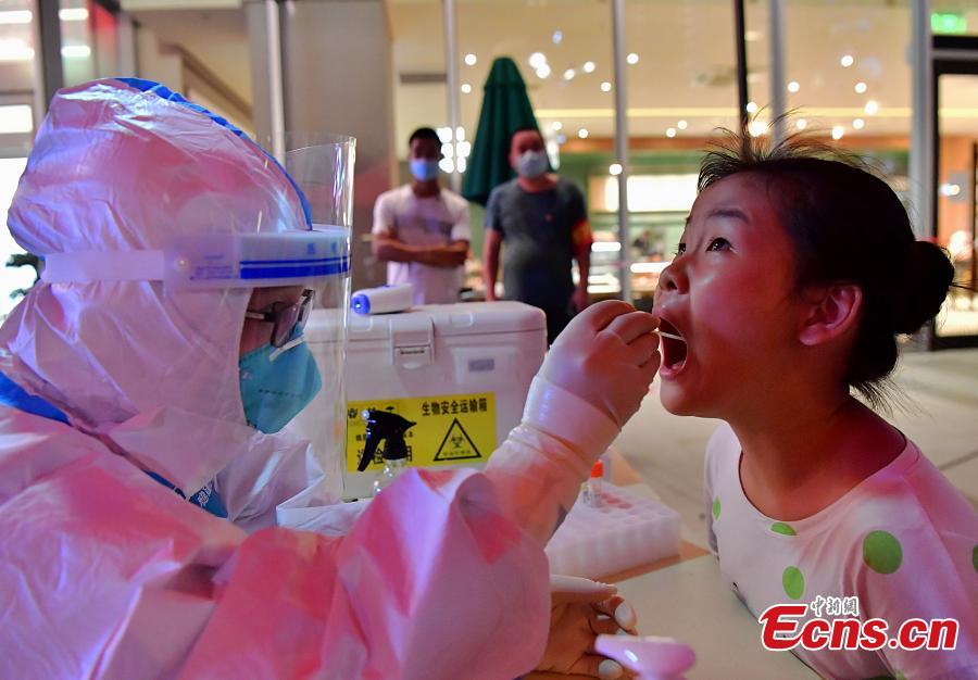 A medical worker takes a throat swab sample from a child for nucleic acid testing in Licheng Street of Xianyou County in Putian City, East China's Fujian Province, September 12, 2021. (Photo: China News Service/Zhang Bin)