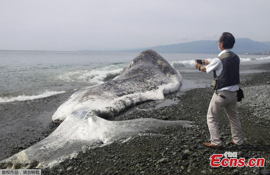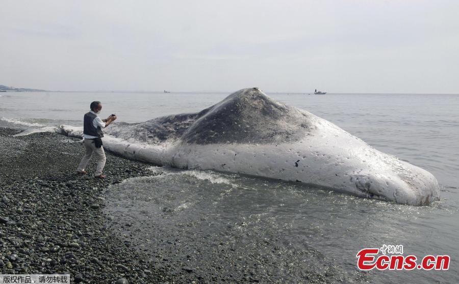 The carcass of a whale is seen at a beach in Odawara, Kanagawa Prefecture, eastern Japan, September 13, 2021. The 14-meter-long whale, believed to be an adult sperm whale, was dead before it washed up on the beach, according to the prefectural government. (Photo: VCG)