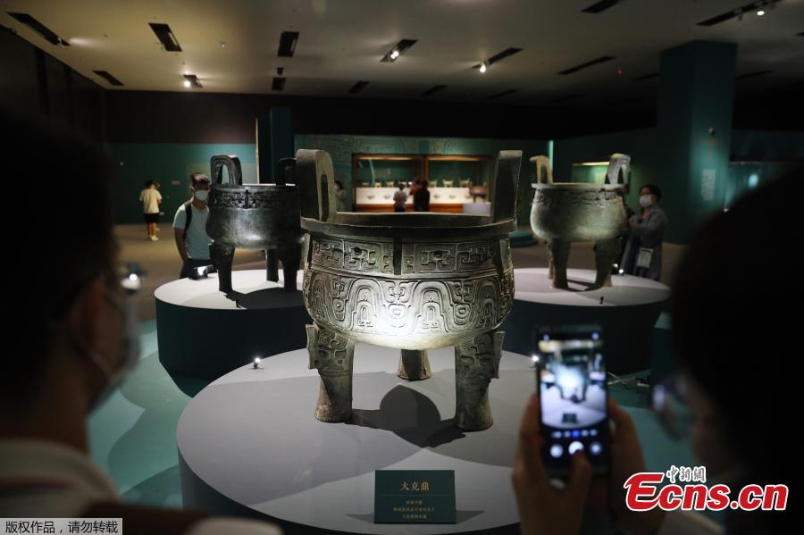 Three most representative large bronze tripods are on display at the National Museum of China in Beijing, capital of China, September 14, 2021. (Photo: China News Service/Shi Chunyang)