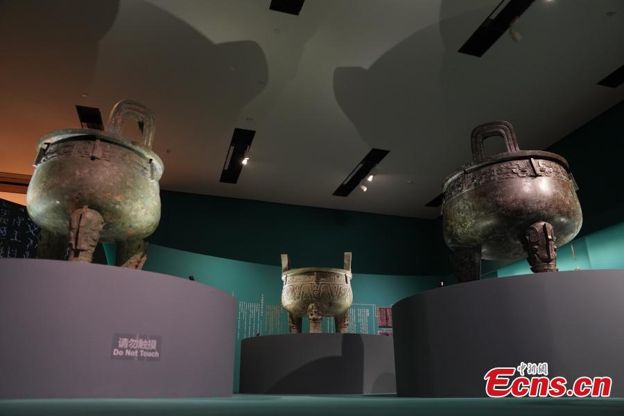 Three large bronze tripods are on display at an exhibition in the National Museum of China in Beijing, capital of China, September 14, 2021. (Photo: VCG)