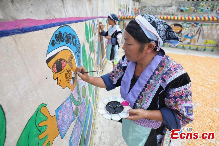 Miao painters repair Miao painting themed murals in Pingpo Village of Longli County, Qiannan Buyi and Miao Autonomous Prefecture, southwest China's Guizhou Province, September 15, 2021. (Photo: China News Service/Qu Honglun)