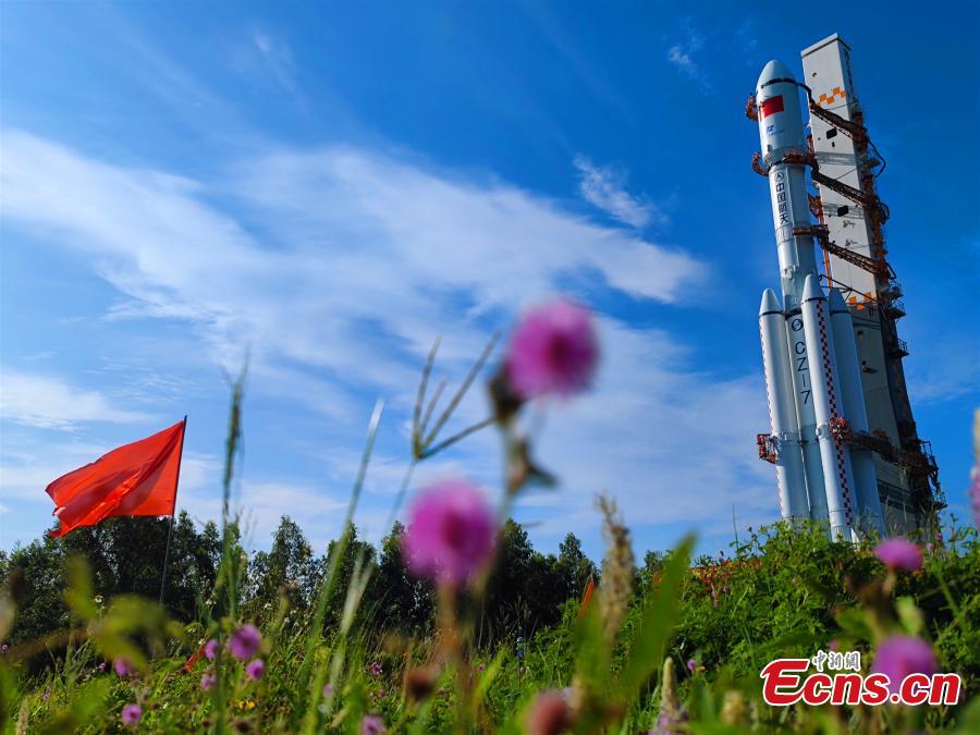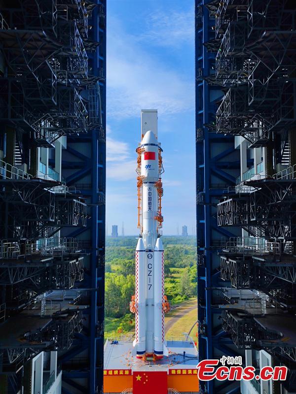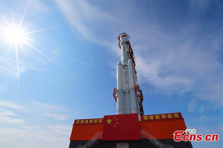 The Long March-7 carrier rocket carrying the Tianzhou-3 cargo spacecraft waits to take off at the launching area of the Wenchang Spacecraft Launch Site in south China's Hainan Province, Sept. 16, 2021. The facilities and equipment at the Wenchang Space Launch site are in good condition, and the subsequent pre-launch function inspections and joint tests will be carried out as planned. (Photo: China News Service/Hu Xujie)
