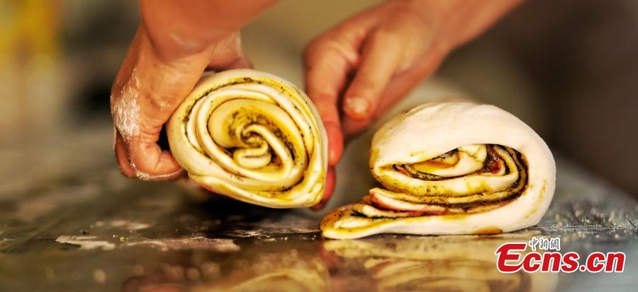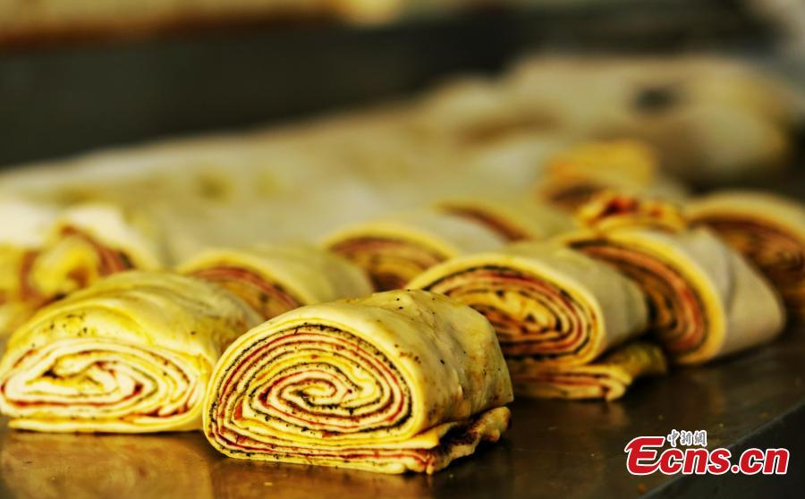 A person roll up layers of flattened dough coated with seasonings in Yuzhong County, northwest China's Gansu Province. (Photo: China News Service/Zhang Wen)