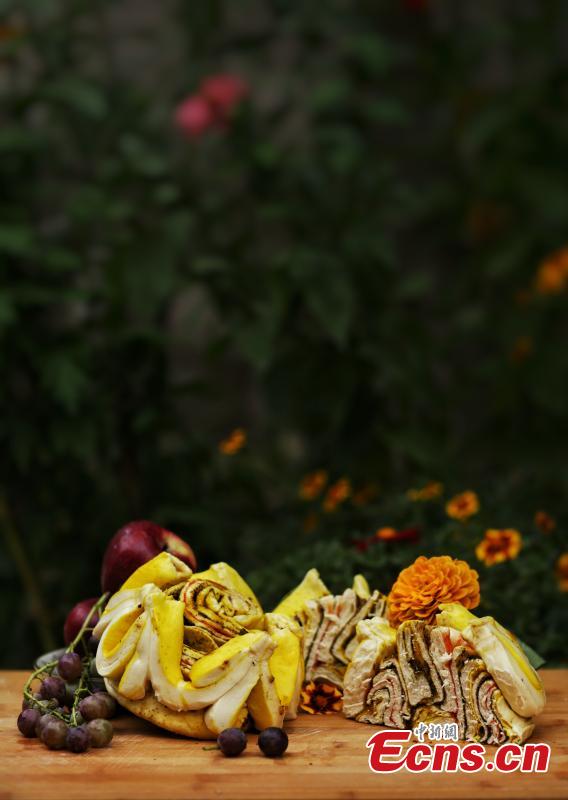 Families in Yuzhong County, Lanzhou Province, have been making traditional multi-layer mooncakes to celebrate the upcoming Mid-Autumn Festival. Following the ancient technique, locals add various condiments such as shortening, turmeric and red yeast rice on flattened dough, and roll them up into the shape of rose flowers.
