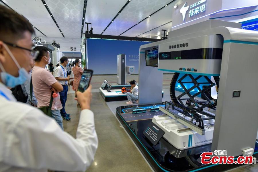 An intelligent flexible bow-shaped charging pile attracts attention at the 2021 World New Energy Vehicle Congress in Haikou, Hainan Province, September 16, 2021. (Photo: China News Service/Luo Yunfei)