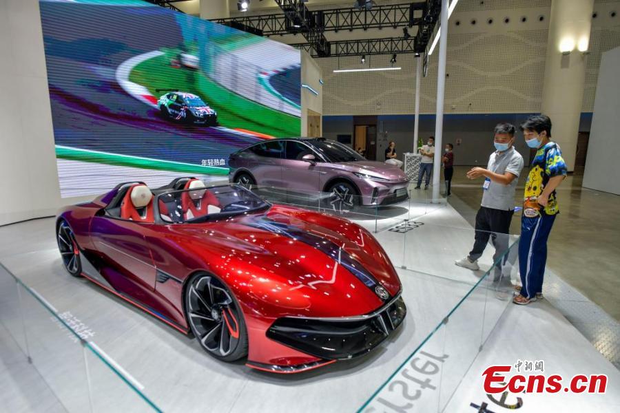 MG all-electric sports coupe is on display at the 2021 World New Energy Vehicle Congress in Haikou, Hainan Province, September 16, 2021. (Photo: China News Service/Luo Yunfei)