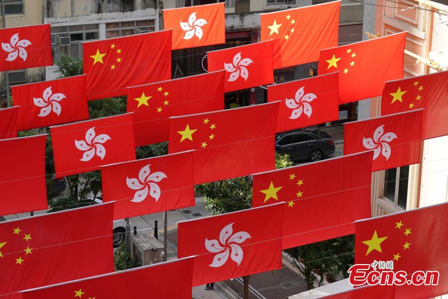 More than 100 Chinese national flags and flags of the Hong Kong Special Administrative Region flutter in Lee Tung street, Hong Kong on Sept. 22, 2021. (Photo: China News Service/Zhang Wei)
