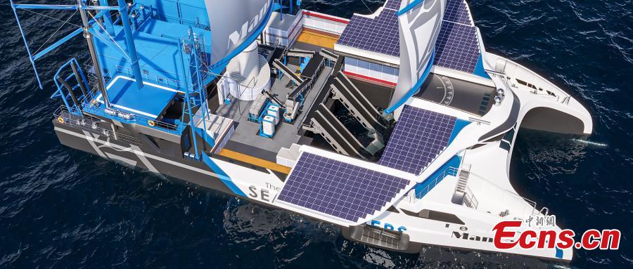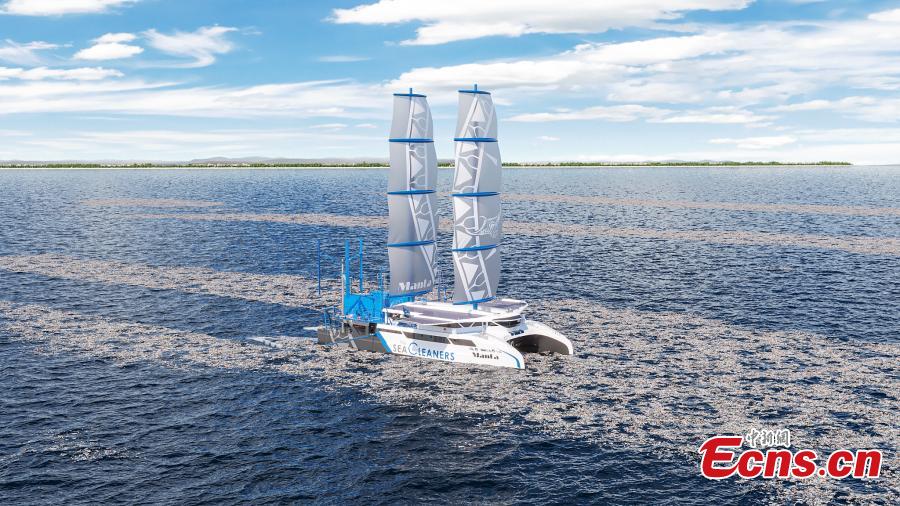 The undated photo shows Manta, a giant hybrid sailboat created by SeaCleaners to reinforce the battle against plastic pollution in oceans. (Photo/VCG)
