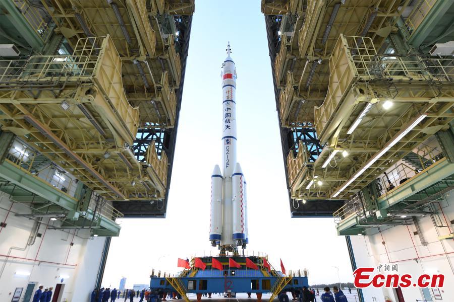 Photo taken on Oct. 7, 2021 shows the combination of China's Shenzhou XIII manned spaceship and a Long March-2F carrier rocket which has been transferred to the launching area of the Jiuquan Satellite Launch Center of the Gobi Desert in northwest China. (Photo: China News Service/Wang Jiangbo)
