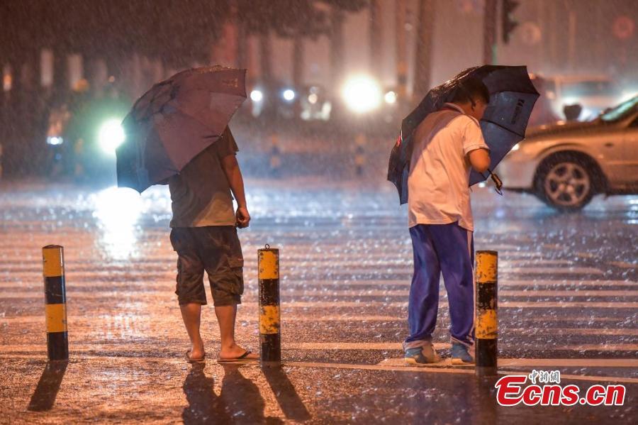 Photo taken Oct. 8, 2021 shows pedestrians in Haikou head forward in the heavy rain. (Photo: China News Service/Luo Yunfei)