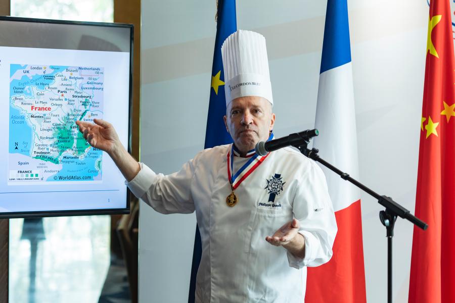 Chef Philippe Groult, director of Ecole Le Cordorn Bleua, gives a presentation on French cuisine in Beijing, Oct. 8, 2021. (Photo: China News Service/Hou Yu)