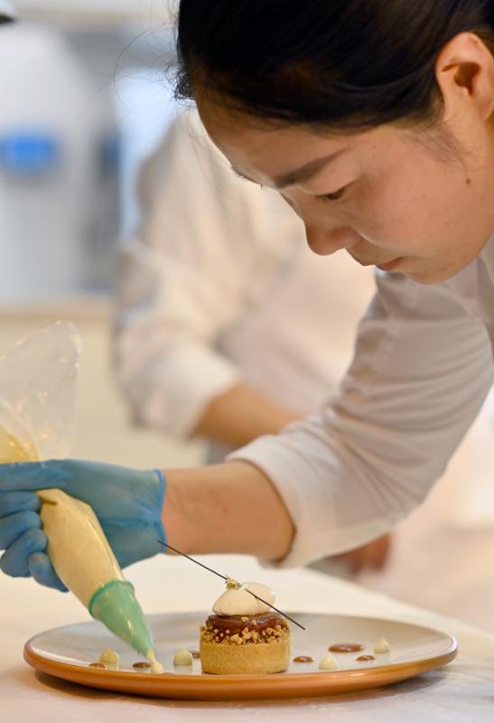 Photo taken on Oct. 8, 2021 shows a P?tissier from the French embassy in Beijing making an Apple tart. (Photo: China News Service/Hou Yu)