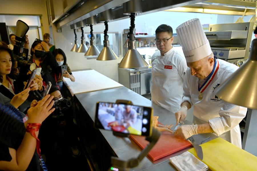 Photo taken on Oct. 8, 2021 shows Chef Philippe Groult, director of Ecole Le Cordorn Bleua (first from right) , demonstrating the production of the French Roast Chicken. (Photo: China News Service/Hou Yu)
