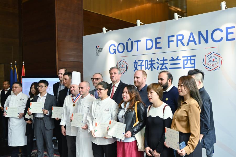 Laurent BILI (fourth from right on the back row), the French Ambassador to China, issues an official certificate for the cooperative restaurant and takes a group photo with participants in Beijing, Oct. 8, 2021. (Photo: China News Service/Hou Yu)