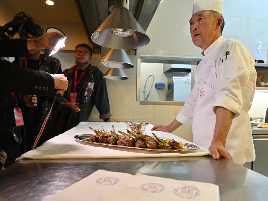 A chef (first from right) from the French embassy in Beijing introduces the cooking of the lamp chop to the media, Oct. 8, 2021. (Photo: China News Service/Hou Yu)