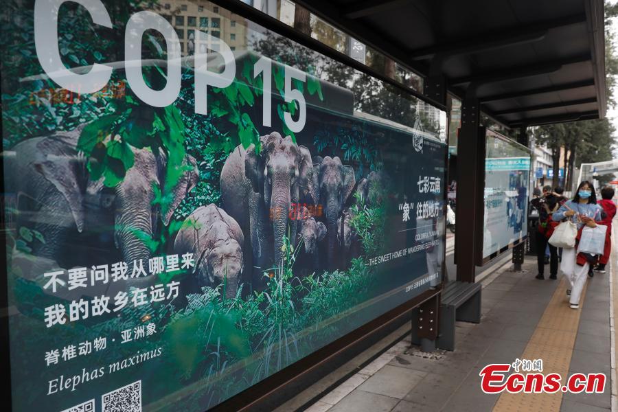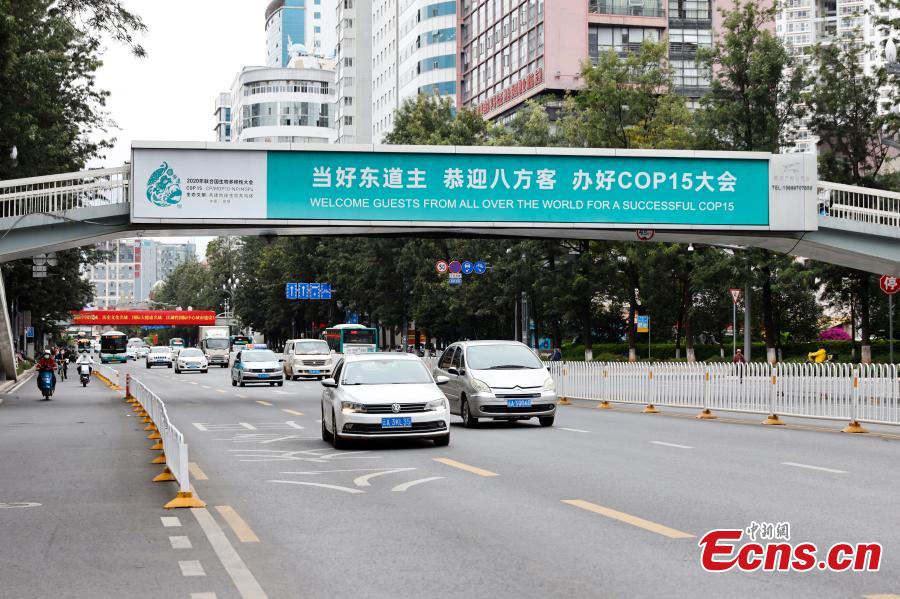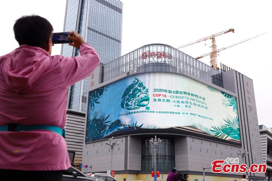 A poster of the 15th meeting of the Conference of the Parties to the UN Convention on Biological Diversity (COP15) is seen in Kunming, capital of southwest China's Yunnan Province, Oct. 11, 2021. (Photo/China News Service)