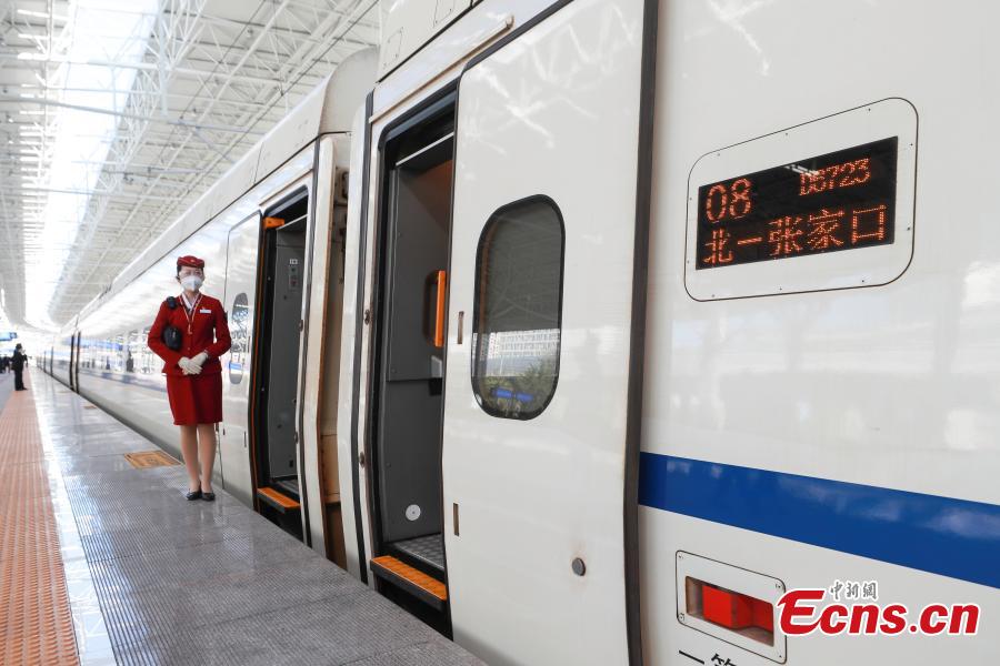 Photo taken on Oct. 11, 2021 shows the Hexie high-speed train bound for Zhangjiakou, the co-host city of the Beijing 2022 Winter Olympics, at Beijing North Railway Station, Beijing. (Photo/China News Service)